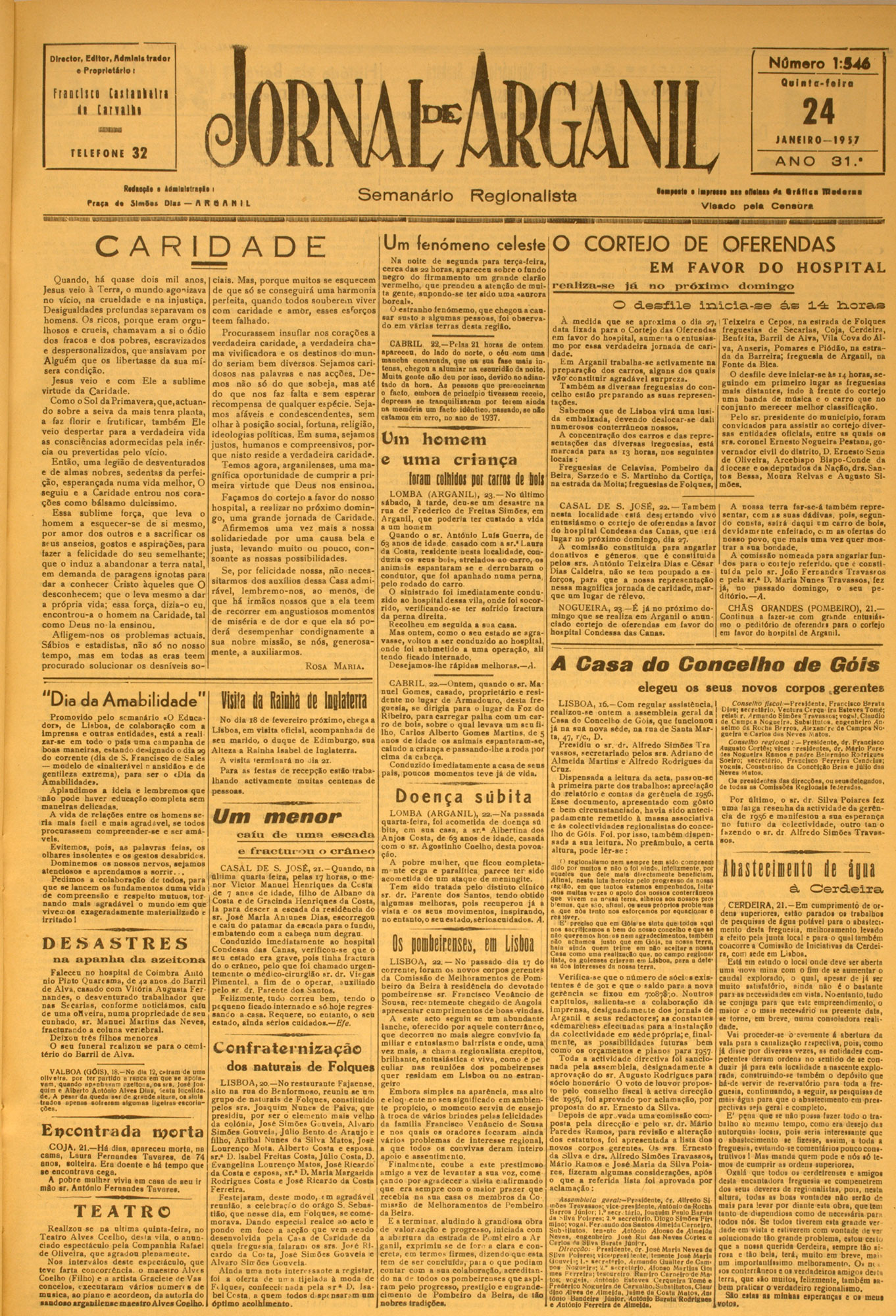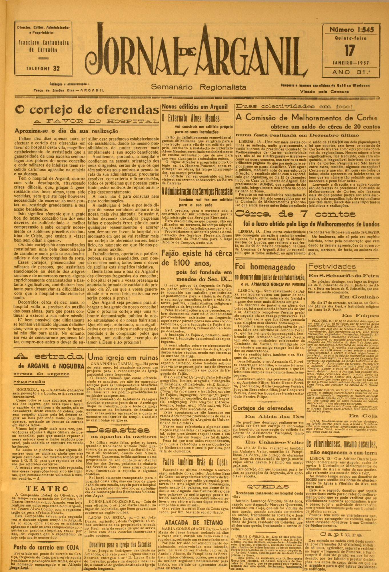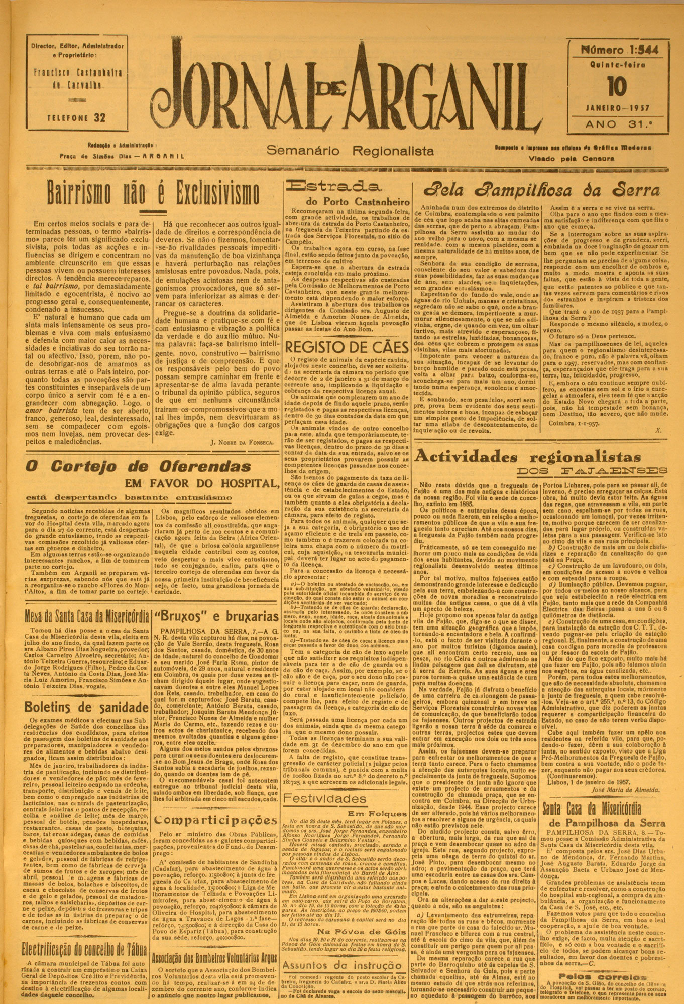Director, editor, Administrador Número 1:5S7 e P ro p rie tá rio I Franci ses C n l i i t i l i i 22 ll [ l l l l l l l TELEFONE NOVEMSRO — 19 S6 32 ANO I i d a l i l i t r i ,| , ! f r«„ (• S im « » D I » — ft R a A N I l Semanário Interesses do concelho ü «Jorn al d e A r g a n i l » n oticiou do aeo visto q n e m u itas pessoas n ão teria m n e último n úm ero q u e o ilu a tre ...