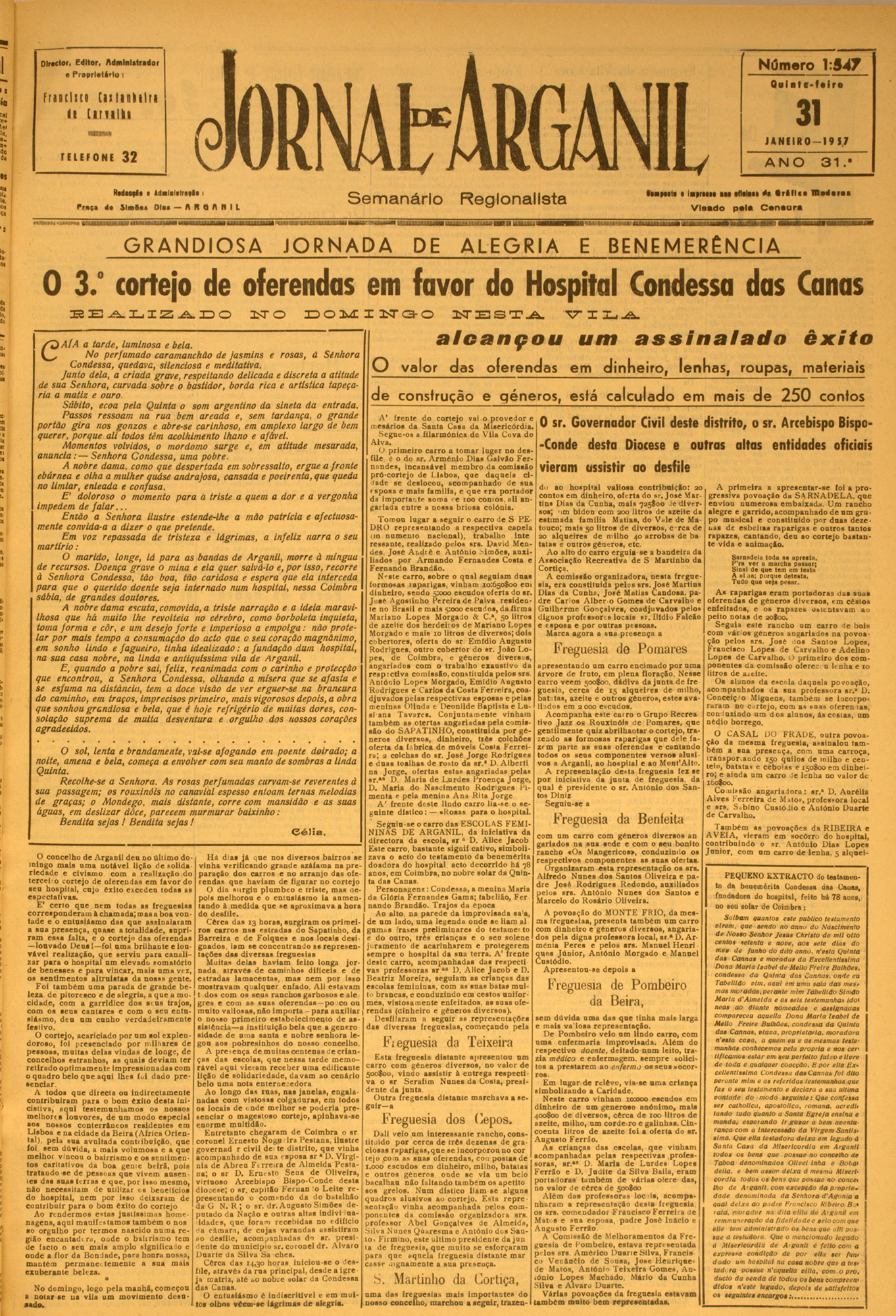 Director, Editor, Administrador • Proprietário t fiaotltti [ittiBkilri ll [IIM ill m am TELEFONE 32 Rodssfis • Adalalstrsfls i Semanário Pros* do S l o la i Olas — A R Q A N I L G R A N D IO S A J O R N A D A DE lia p tid , la,ren t Reglonallsta A L E G R IA V la a d o E ilW na M • r i l l , , M p a l* in i C a n iu ri B E N E M E R Ê N C IA 0 3.° cortejo de oferendas em favor do Hospital Condessa das Canas SEALIZADO NO DOMI NGO AÍA a tarde, Luminosa e bela. No perfumado caramanchão ...