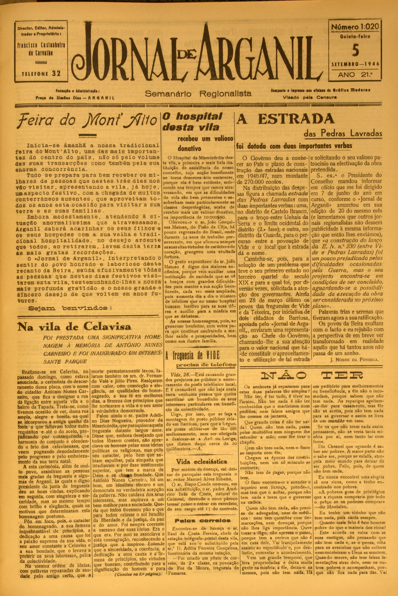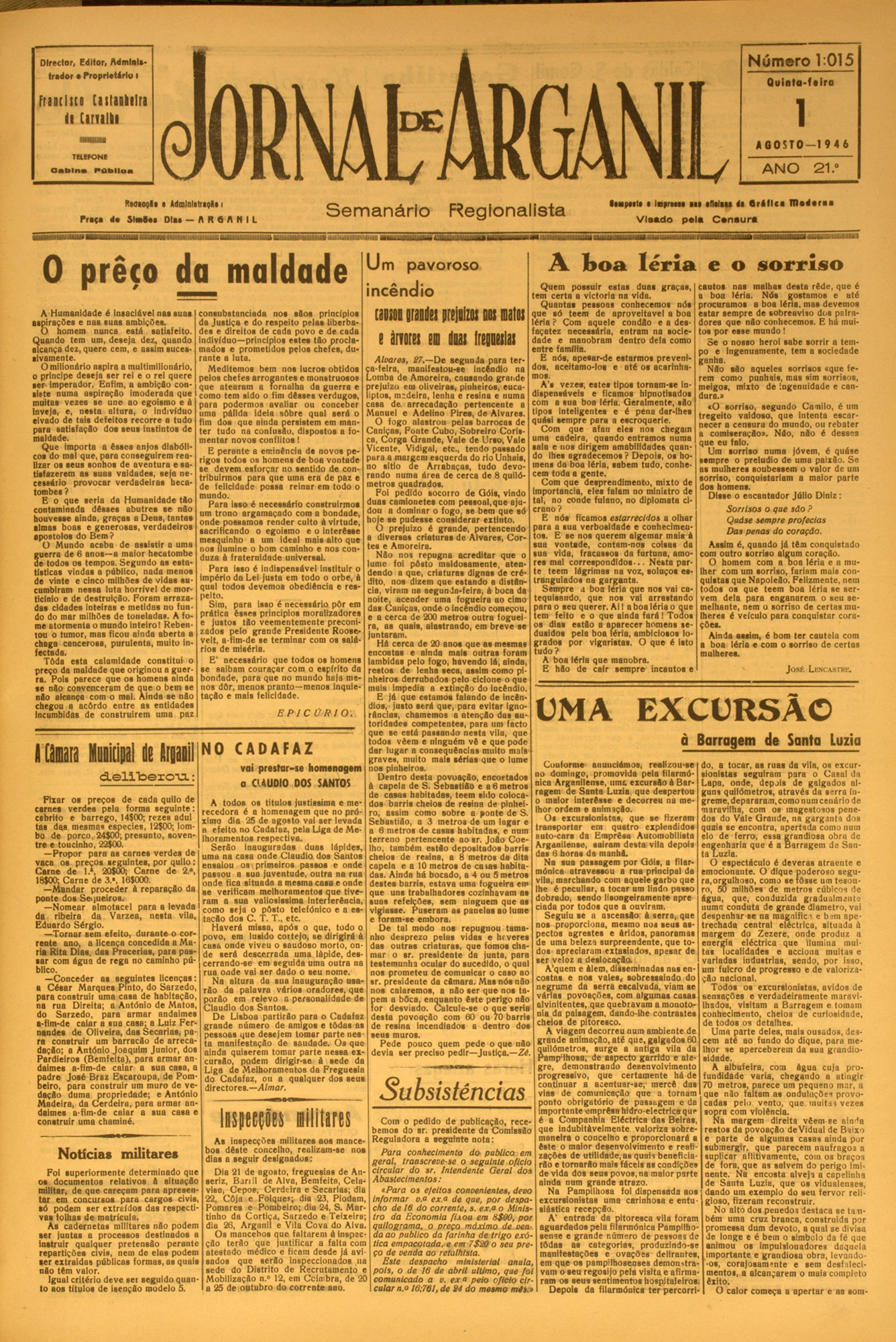 N ú m e r o 1 :0 1 5 Director, Editor, Atfmlnlttrador a Proprietário I Qulnta-foiro Fraotlid Cistulilri (i Ciriilli 1 IlllllilllllUU A G 0ST0— 19 4 6 TELEFONE ANO O a b l n a P ú b l lo a Fteoooglo • Admlnlotropâo i Prate da SlaS.a Dlaa — A R O A N I L S e m a n á rio R eglonalista 21.° leapeele a lapreeae aae elWaw da S rd llc a m a d e ra a V lo o d o pe la C a n a u ra ................ 0 prêço da maldade A Humanidade é insaciável nas suas aspirações e nas suas ambições. O homem nunca está satisfeito. Quando tem um, deseja dez, quando alcança ...