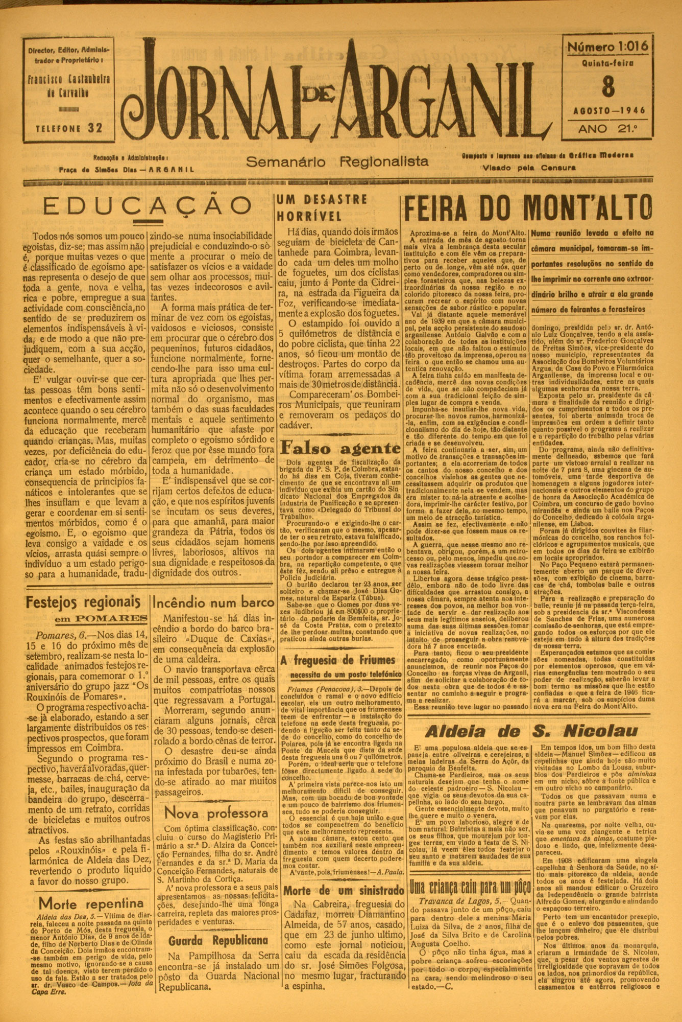 nal-Arganil Número 1:016 Director. Editor, Admlol*trador • Proprietário I Quluta-foiro friKiiti Usliililri H [iitilli 8 AGOSTO— 1946 TELEFONE ANO 21. 32 Hm io ç I í a Admlolitreoia i Praça da ] l a i u Dlaa - A H i A H I I EDUCACAO Sem anário Reglonalista (•■PM I* • laraaaa aaaa flo laaad atrltlaa IKodona V leado polar C o n o u ro aiiuiuiuiiiiuiitiiiiiiiiiii i UM DESASTRE HORRÍ VEL FEIRA DO MONrALTO dois irmãos Aproxima-se a feira do Mont’Alto. Num a rtunião levada a efeito na Todos nós somos um pouco zindo-se numa insociabilidade Há dias,dequando A entrada de mês de agosto torna bicicleta de Can- mais viva a lembrança desta secular câmara municipal, tom aram -se im egoístas, diz-se; mas assim não prejudicial e conduzindo-o ...