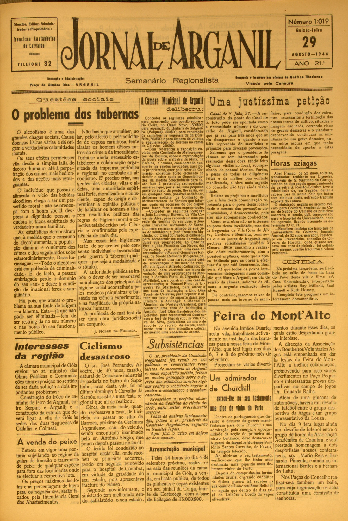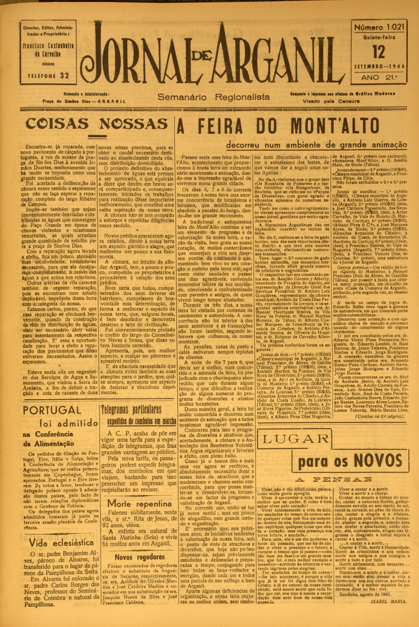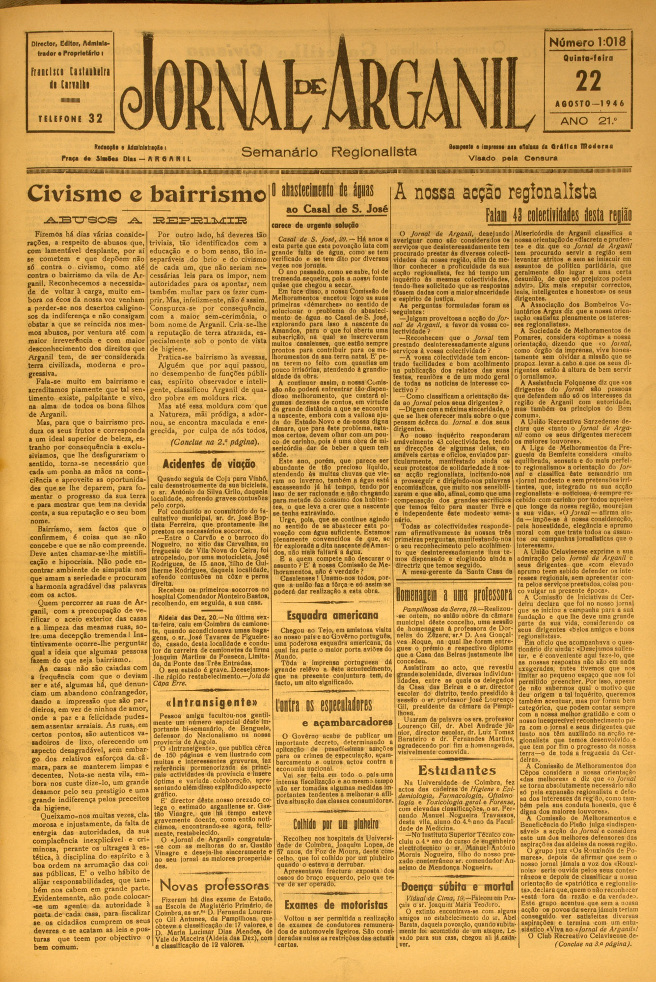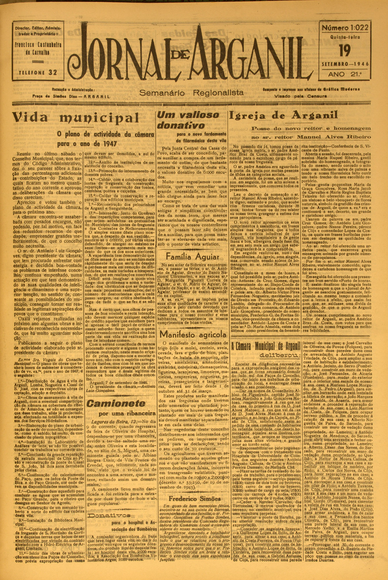 Número 1:022 Director, Editor, AdmlaUtridor • Proprietário I FriDtlici Cistiokilri li Cirulli Q u in t a - U ir a JORNAtMGANIL 1 9 SETEM BRO— 1 9 4 6 TELEFO N E 32 ANO Ktdaoçld ■ AdmlDlitnçli i Priço d * S l a h i D l u — It R Q A H I L S e m a n á rio Vi da tpupicipal 0 plano de adividade da câmara R egionalista U m v a lio s o d o n a tiv o para o novo fardamento 21 .° ••■poitd ■ lapreiM I II «fliliti di • r i l l c a D l i d i t u V is a d o pela C s n ...
