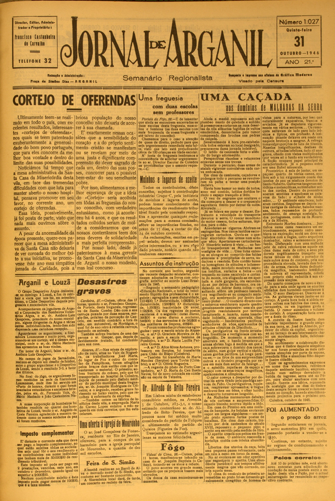Número 1027 Director, Editor, Admlolotrador o Proprietário ■ nal-Arganil Quinta-f oiro fnicliii liitiililn li (ariilli 31 OUTUBRO— 1 94 6 TELEFONE 32 ANO Xaaaapit • idnlalitiapia i Pratt do i M t a Dlaa - Altai II L Semanário Reglonalista 21." laapaoti • loiratti an oflalaaa da B r l l l t a U lo d o ra a V is a d o p e la C an au ra ■juuuuiiiwiiiiiiiaiiiiii freguesia U M A C A Ç A D A CORTEJO DE OFERENDAS Jm a com duas escolas nos dom ínios de MALHADAS DA SERRA sem professores Ultimamente teem-se reali zado em todo o pafs, com ex celentes resultados, interessan tes «cortejos de oferendas», nos quais se teem patenteado exuberantemente a generosi dade do bom povo português, que para eles concorre da me lhor boa vontade ...