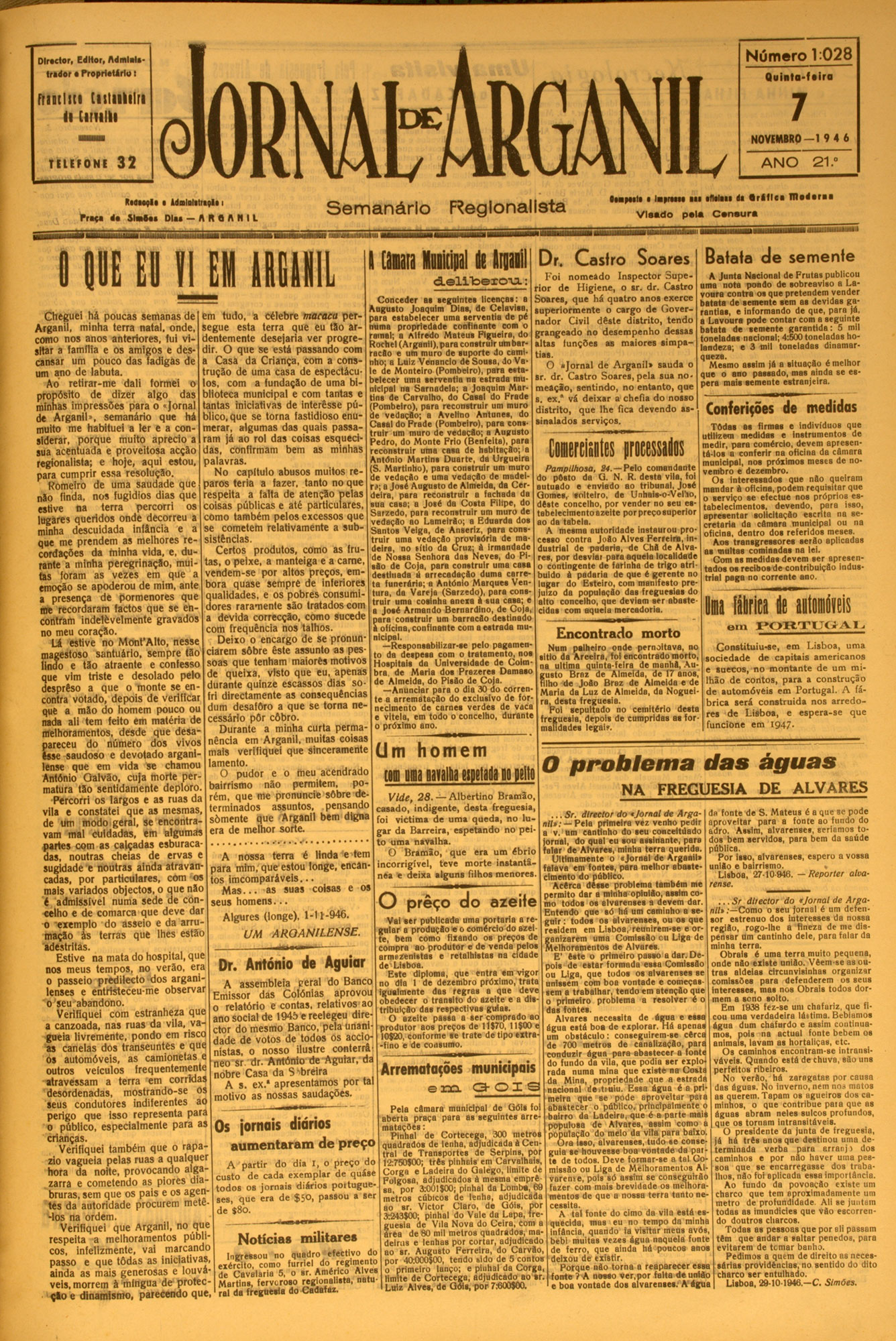 Número 1:028 Director. Editor. AdmlateIrador • Propri.Urlu: Quiiila-fdira Friiiliti (iitnlilra li (inilli TELEFONE n a l - A r g a n il 32 iM I tfli • IdBlalilnpii i F ret* d« S l * i u D lu — A R a I 11 L Semanário I HEEl II EMHIE Regionalista I Uiaia Kminpil It H I NOVEMBRO—19 4 6 ANO 2 1 ." ••apnl* • '■prana ■■■ tltolait di • r l l l c i I D i d m i V laado pala C an au ra Dr. Casfro Soares Batais de semente A Junta Nacional de Frutas publicou F o i no m ead o In sp e c to r S u p e rio r ...