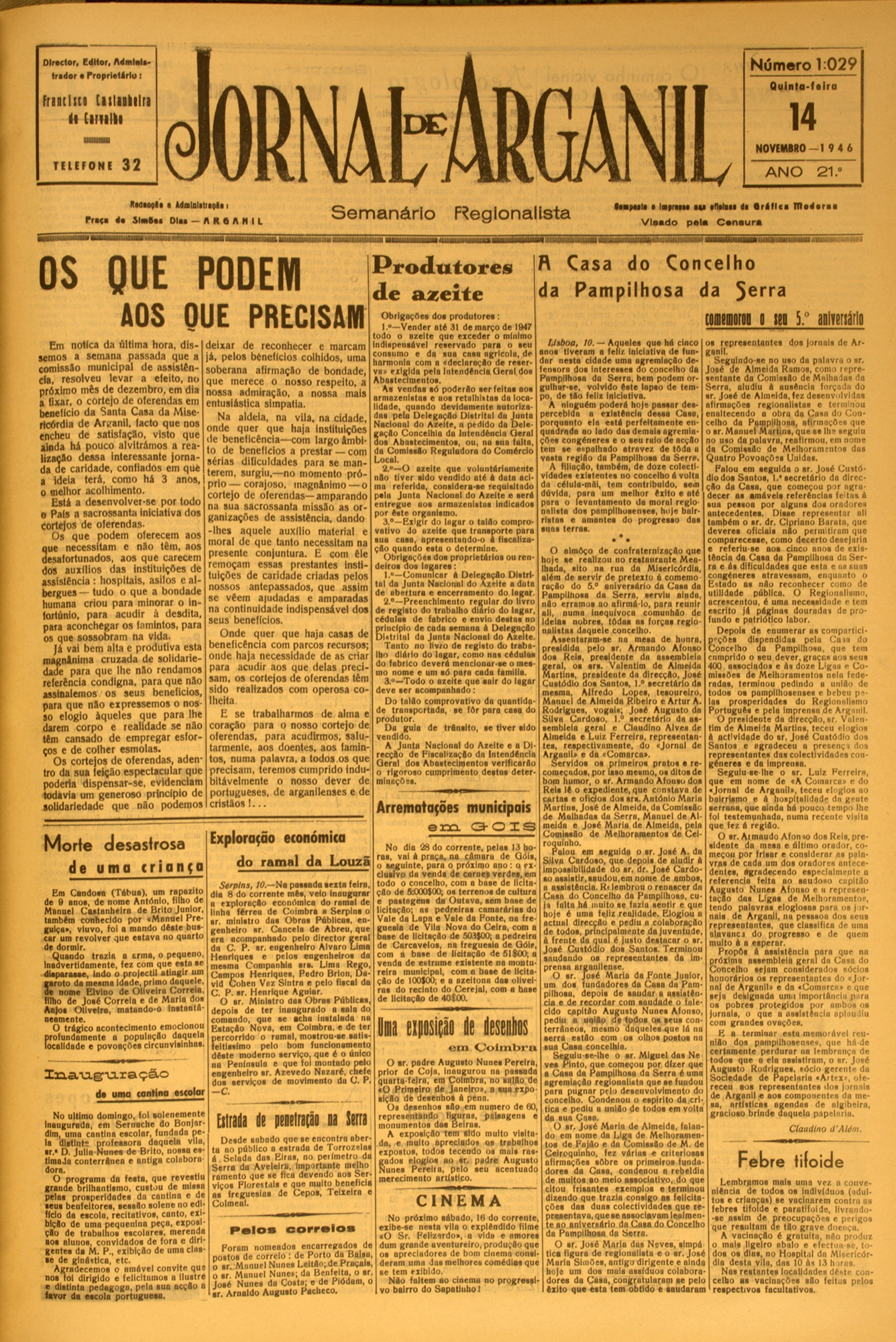 Director, Editor, AdmlaU- Número 1:029 trador • Proprietário t Q u inta -fe ira flrntltti Uitiililn 14 ii llllllll NOVEMBRO - 1 9 4 6 TELEFONE 32 ANO Rm h , I , • t d a lD liliiç l, I rr» t« ú * 5 l n t u D l» — A R a A N I L Sem anário Ftegionallsta 21." ••■paita • lapraaaa a u aflalaai da t r á f l c a T n o d a ra a V is a d o p a la C a r ta u r a luiuuiiiiiiiiiimiiMfium OS QUE PODEM P ro d u to res de azeite AOS OUE PRECISAM R da C asa do C o n c e lh o P a m ...