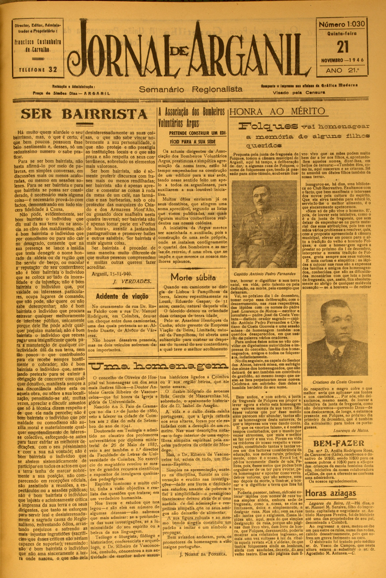 Número 1:030 Director, Editor, Admlolotredor o rroprlotirtg : Quiata-fdiro Friitliti liiliililri ii u iiiik i NAbÂRGANIL 21 NOVEMBRO— I 9 4 6 TE L E F ONE 32 ANO RmmçI i ■ AdDlolitriQic i S lw é .» DIm — A R A I S e m a n á rio R eg lo na lista h a p ill • la p m V is a d o 2 1 .° M l (IM aii dl B r i l l c i n t o d o r i l p s la C sn a u rs HiUUIUUIlUlilllllHHliUIl SER BAIRRISTA I ta iitã o dos In tu is lilntíriís irgas HONRA AO I^ o lq .u L @ M É R IT O s rraí h ...