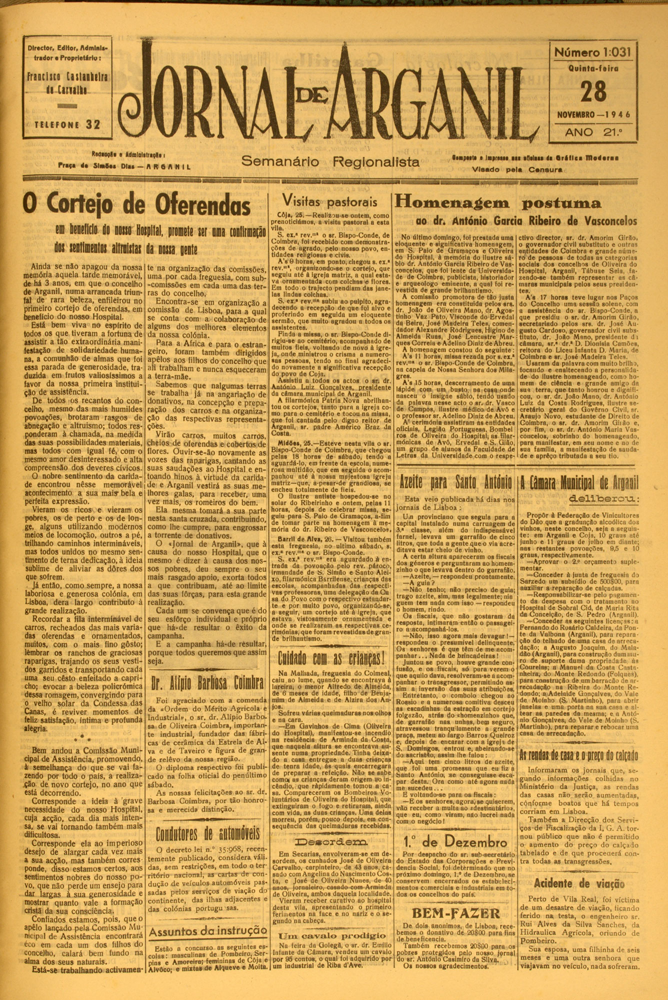 Director, Editor, Adminis N ú m ero 1:031 trador • Proprietário: n ah -Arganil Q u in t o - f t ir a F r ir d iti C is lu lilr i it Cirialki 28 NOVEMBRO— 1 9 4 6 TELEFONE 32 ANO • tdmlnlittipli i Prat* 4a SlaiBas Dlaa — A It Q A N I L S e m a n á rio 0 Cortejo de Oferendas in beieddi do nosto Hospital, promete set oma confirmação dos seotlmeotos altrnistas do nossa oente Ainda se não apagou da nossa memória aquela tarde memorável, de há 3 anos, em que o concelho de Arganil, numa arrancada triun fal de rara beleza, enfileirou no primeiro cortejo de oferendas, em beneficio do nosso Hospital. Está bem viva ...